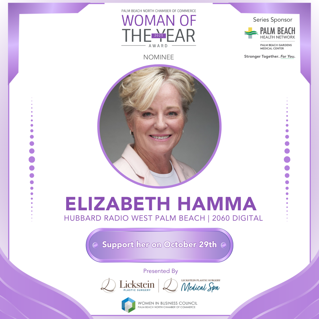 We are thrilled to announce that Elizabeth Hamma, Market President of Hubbard Radio West Palm Beach, LLC & 2060 Digital, has been officially nominated for the prestigious 2025 Woman of the Year Award by the Palm Beach North Chamber of Commerce.